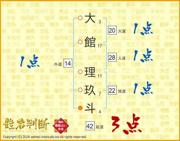 大(3画)館(17画) 理(11画)玖(7画)斗(4画)