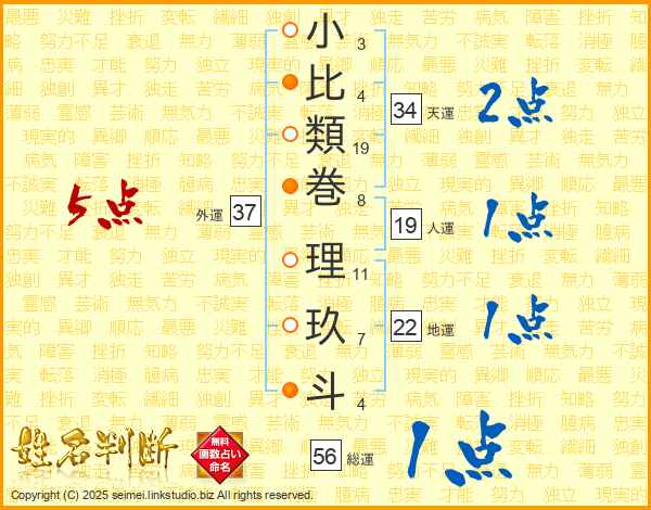 小(3画)比(4画)類(19画)巻(8画) 理(11画)玖(7画)斗(4画)