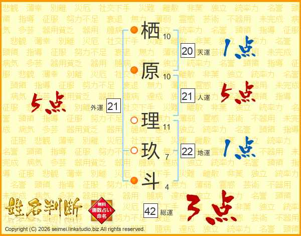 栖(10画)原(10画) 理(11画)玖(7画)斗(4画)