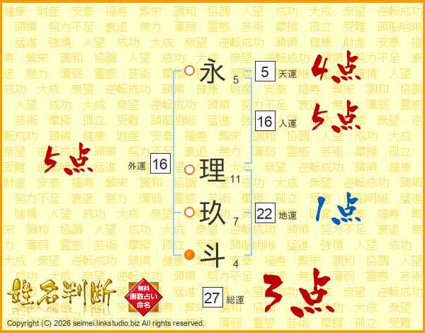 生活面を象徴する運勢です。外部から受ける影響力を表し、結婚運、家庭運や職場、環境への順応性を表します。総運から人運を引いた画数。姓や名が1文字の場合を除く。