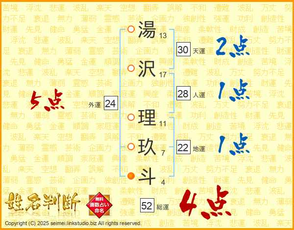 湯(13画)沢(17画) 理(11画)玖(7画)斗(4画)