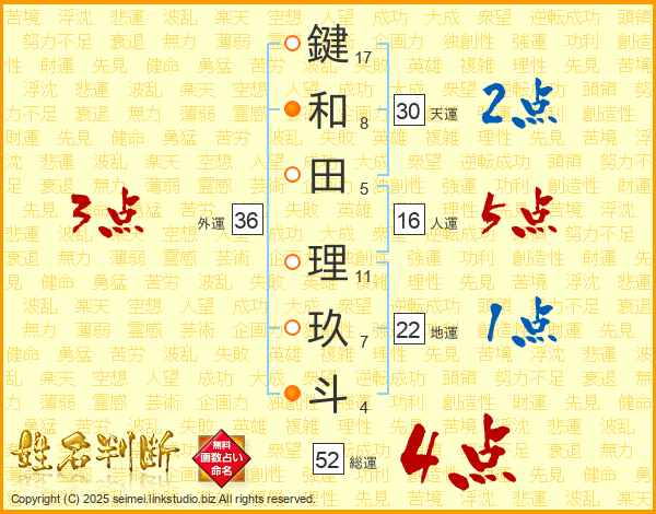 鍵(17画)和(8画)田(5画) 理(11画)玖(7画)斗(4画)