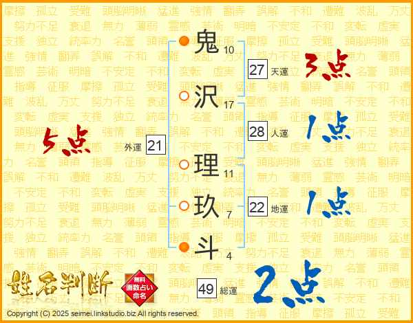 鬼(10画)沢(17画) 理(11画)玖(7画)斗(4画)