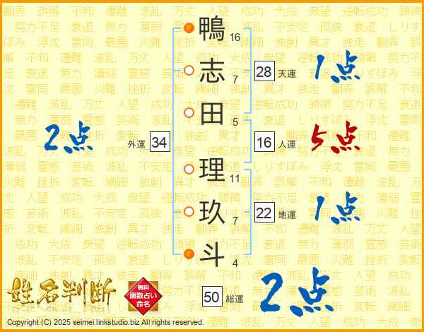 鴨(16画)志(7画)田(5画) 理(11画)玖(7画)斗(4画)