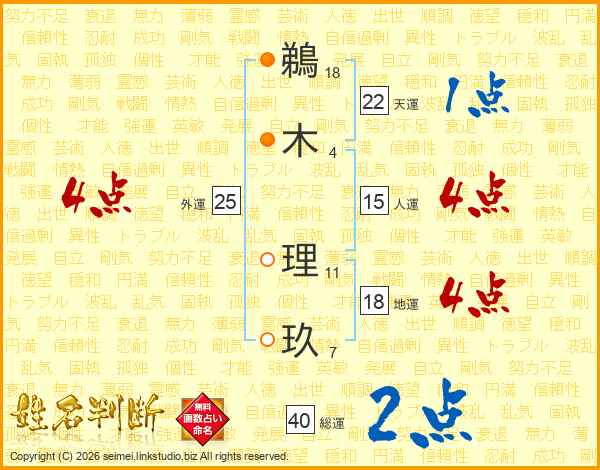 鵜(18画)木(4画) 理(11画)玖(7画)