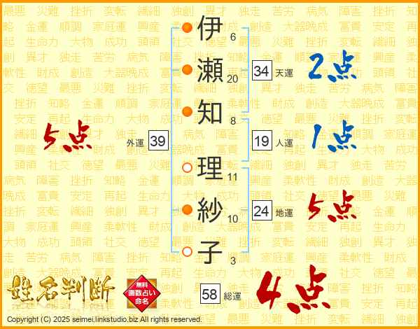 伊(6画)瀬(20画)知(8画) 理(11画)紗(10画)子(3画)