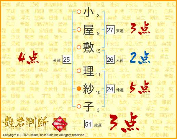 小(3画)屋(9画)敷(15画) 理(11画)紗(10画)子(3画)