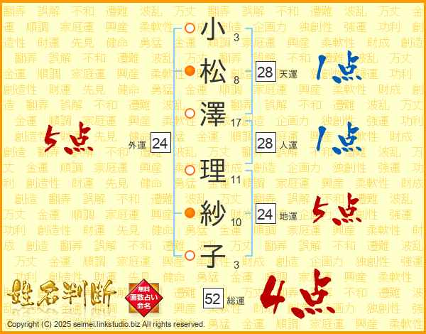 小(3画)松(8画)澤(17画) 理(11画)紗(10画)子(3画)