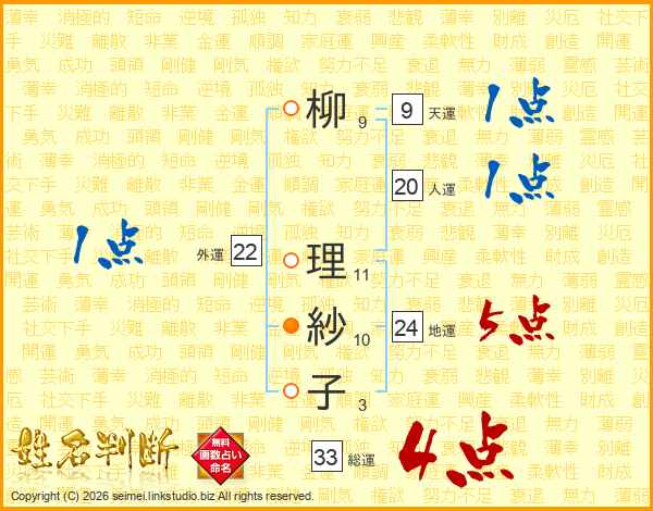 柳(9画) 理(11画)紗(10画)子(3画)