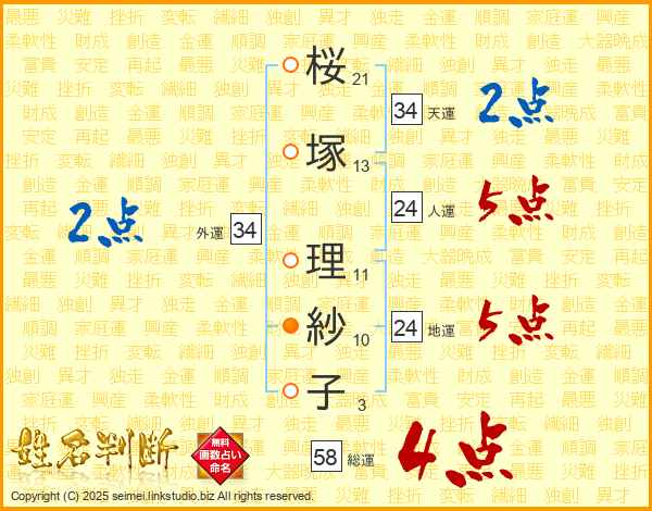桜(21画)塚(13画) 理(11画)紗(10画)子(3画)