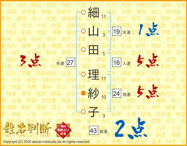 細(11画)山(3画)田(5画) 理(11画)紗(10画)子(3画)
