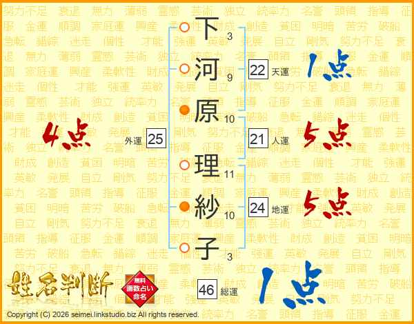 下河原理紗子さんの総運は46画の1点!