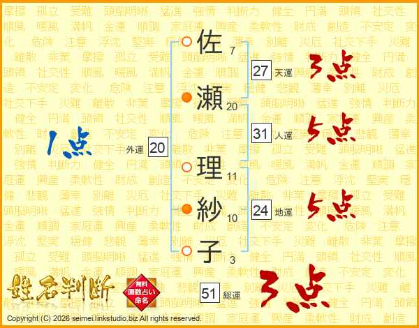佐(7画)瀬(20画) 理(11画)紗(10画)子(3画)