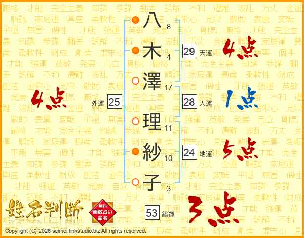 八(8画)木(4画)澤(17画) 理(11画)紗(10画)子(3画)
