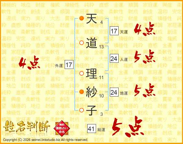 天(4画)道(13画) 理(11画)紗(10画)子(3画)