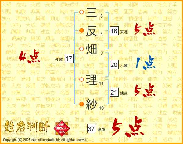 生活面を象徴する運勢です。外部から受ける影響力を表し、結婚運、家庭運や職場、環境への順応性を表します。総運から人運を引いた画数。姓や名が1文字の場合を除く。