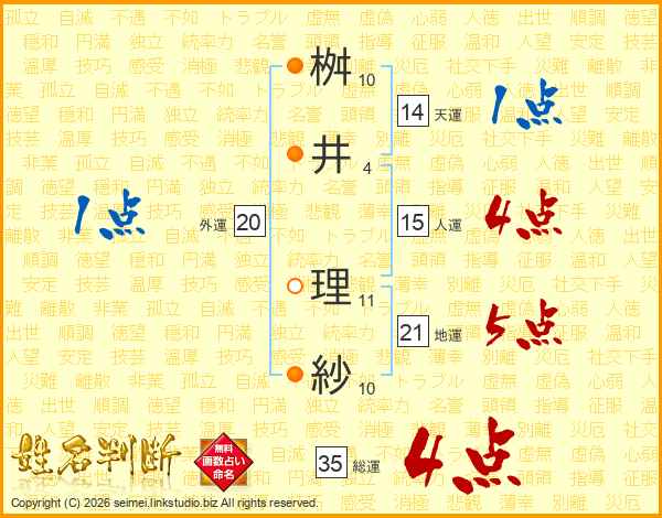 桝(10画)井(4画) 理(11画)紗(10画)