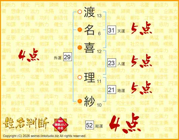 渡(13画)名(6画)喜(12画) 理(11画)紗(10画)