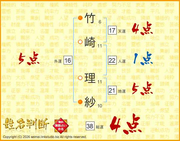 竹(6画)崎(11画) 理(11画)紗(10画)