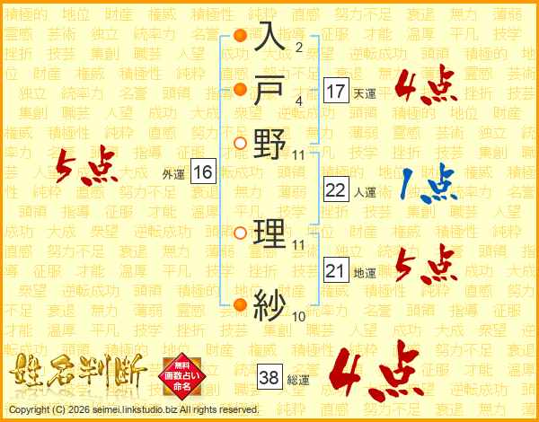 入(2画)戸(4画)野(11画) 理(11画)紗(10画)