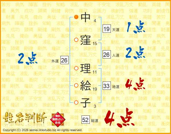 中(4画)窪(15画) 理(11画)絵(19画)子(3画)