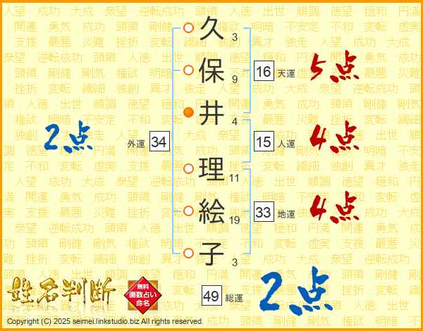 久(3画)保(9画)井(4画) 理(11画)絵(19画)子(3画)