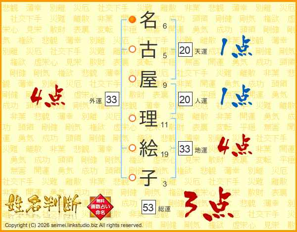 名(6画)古(5画)屋(9画) 理(11画)絵(19画)子(3画)