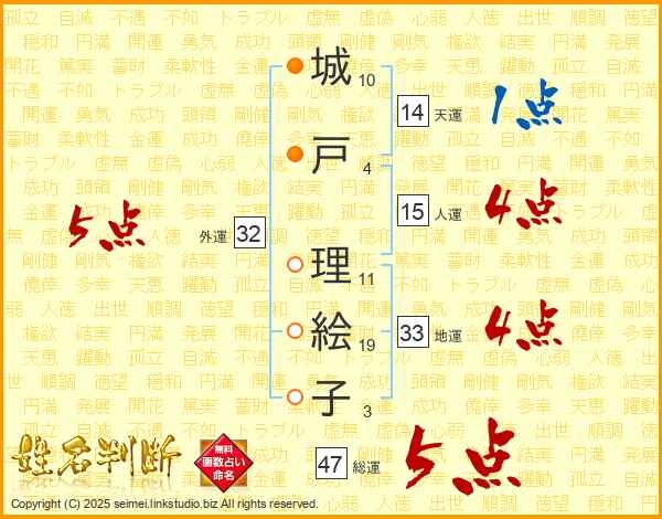 城(10画)戸(4画) 理(11画)絵(19画)子(3画)