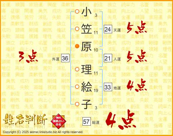 小(3画)笠(11画)原(10画) 理(11画)絵(19画)子(3画)