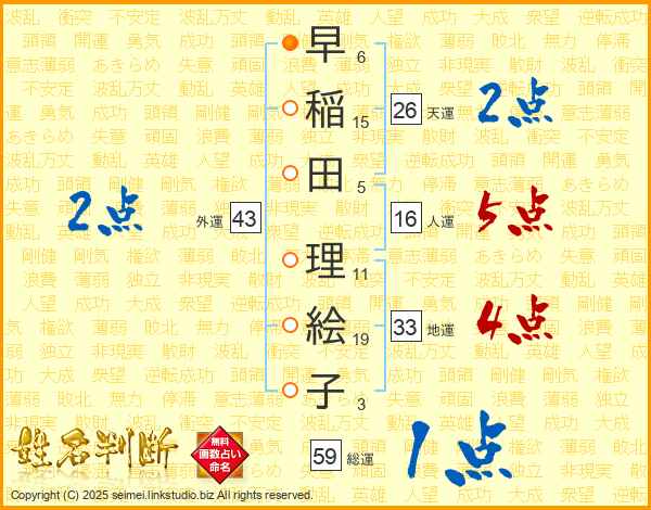 早(6画)稲(15画)田(5画) 理(11画)絵(19画)子(3画)