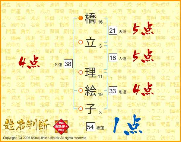 橋(16画)立(5画) 理(11画)絵(19画)子(3画)