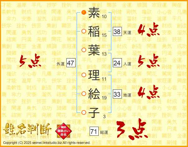 素(10画)稲(15画)葉(13画) 理(11画)絵(19画)子(3画)