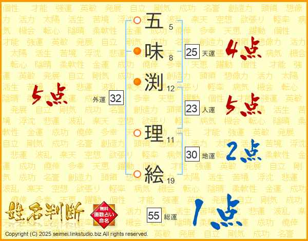五(5画)味(8画)渕(12画) 理(11画)絵(19画)