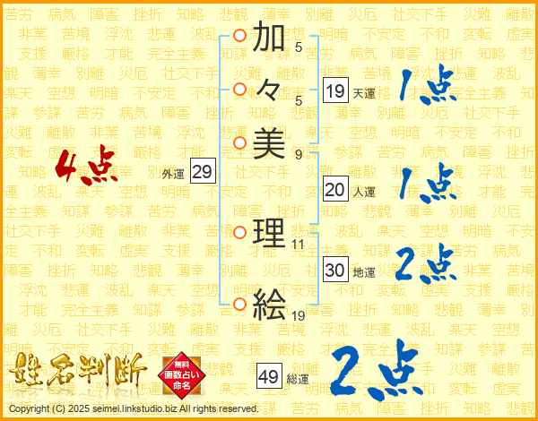 加(5画)々(5画)美(9画) 理(11画)絵(19画)
