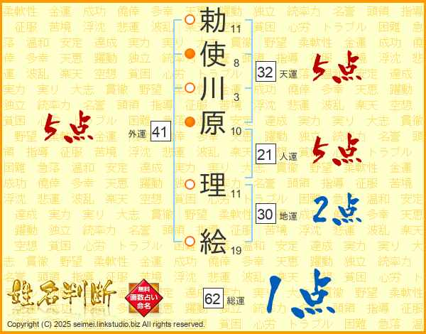 勅(11画)使(8画)川(3画)原(10画) 理(11画)絵(19画)