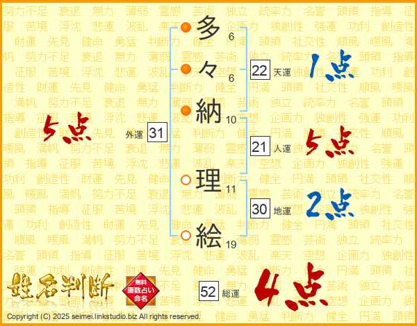 多(6画)々(6画)納(10画) 理(11画)絵(19画)