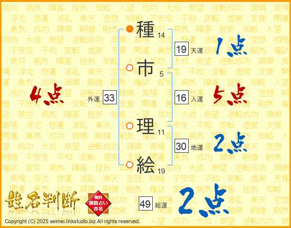 種(14画)市(5画) 理(11画)絵(19画)