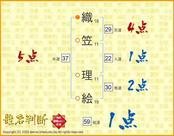 あなたの人生を表す1番重要な運勢です。生涯を通じて影響する総合運となり、主に50歳以降の晩年期に影響を及ぼします。苗字と名前の合計画数。