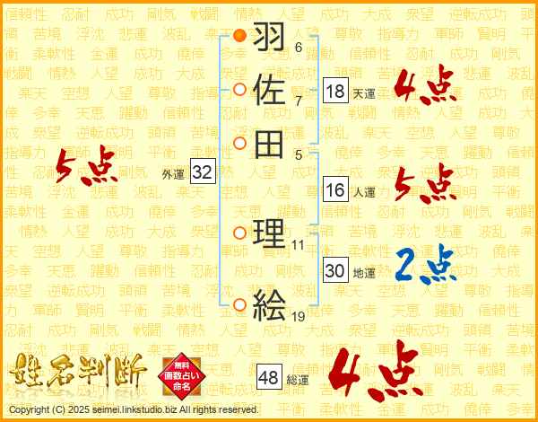 羽(6画)佐(7画)田(5画) 理(11画)絵(19画)