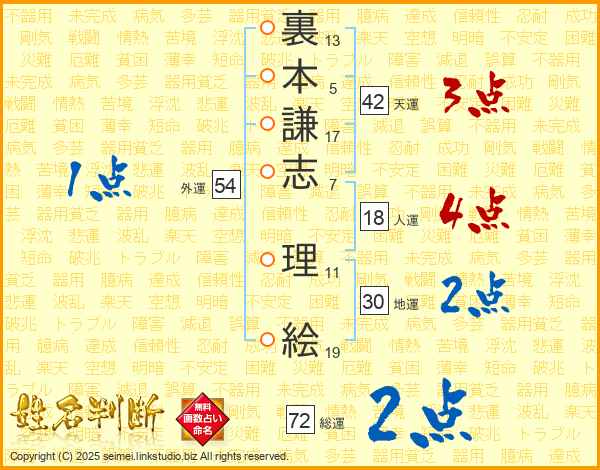 裏(13画)本(5画)謙(17画)志(7画) 理(11画)絵(19画)