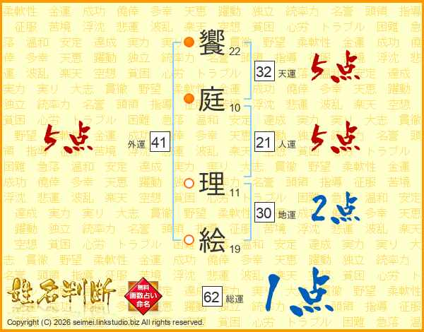 生活面を象徴する運勢です。外部から受ける影響力を表し、結婚運、家庭運や職場、環境への順応性を表します。総運から人運を引いた画数。姓や名が1文字の場合を除く。