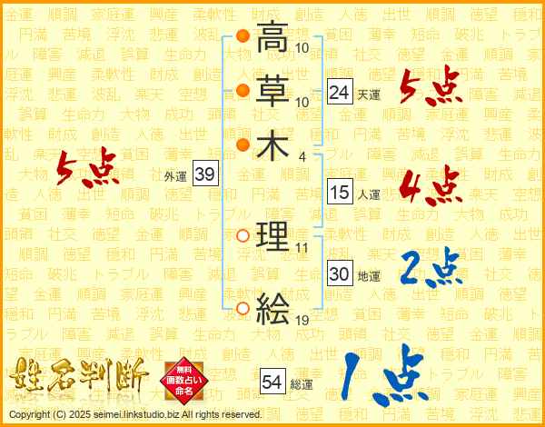 高(10画)草(10画)木(4画) 理(11画)絵(19画)