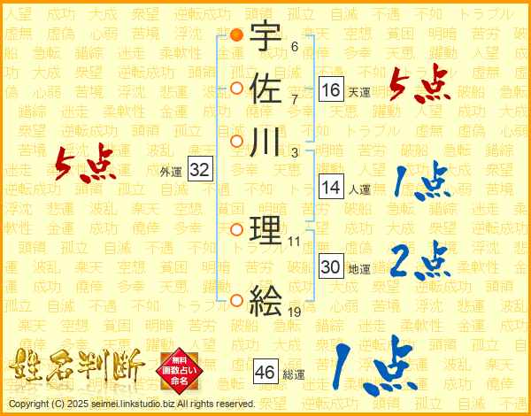 宇(6画)佐(7画)川(3画) 理(11画)絵(19画)