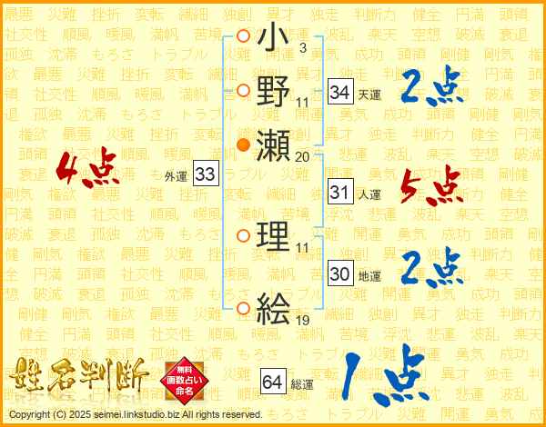 小(3画)野(11画)瀬(20画) 理(11画)絵(19画)