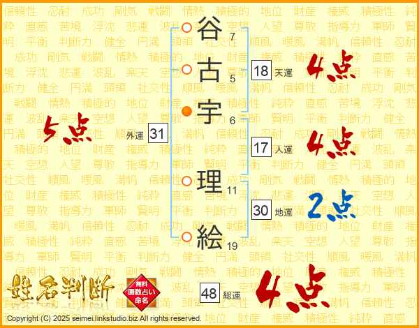 谷(7画)古(5画)宇(6画) 理(11画)絵(19画)