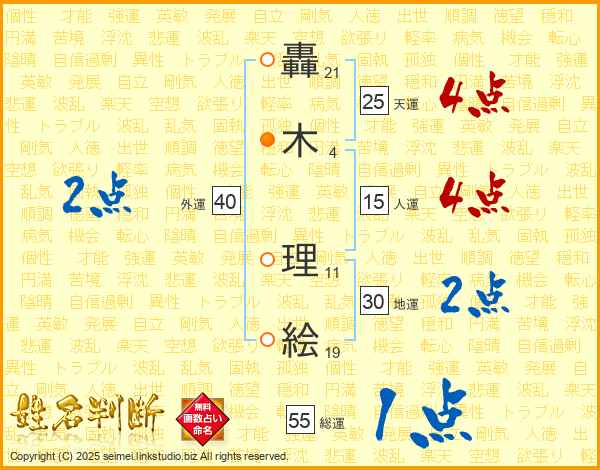 生活面を象徴する運勢です。外部から受ける影響力を表し、結婚運、家庭運や職場、環境への順応性を表します。総運から人運を引いた画数。姓や名が1文字の場合を除く。