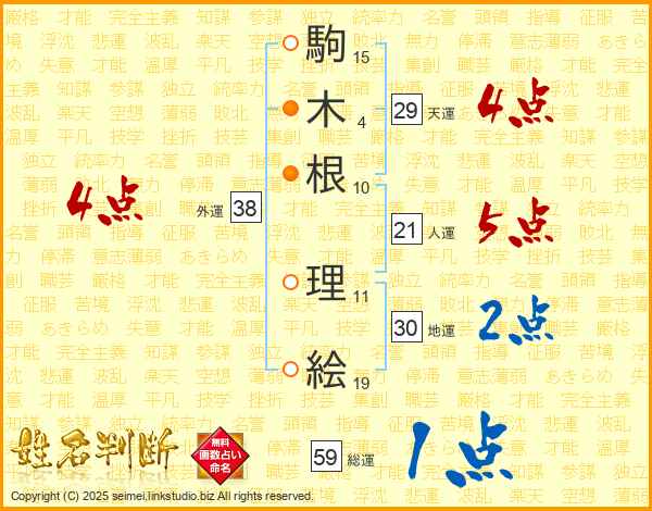 駒(15画)木(4画)根(10画) 理(11画)絵(19画)