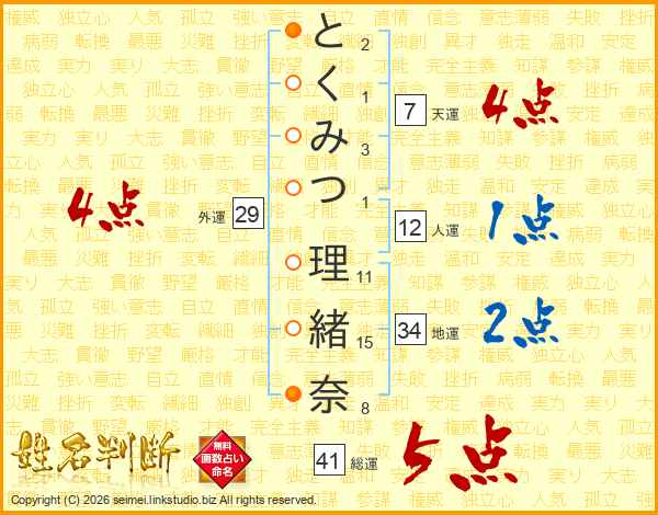 と(2画)く(1画)み(3画)つ(1画) 理(11画)緒(15画)奈(8画)