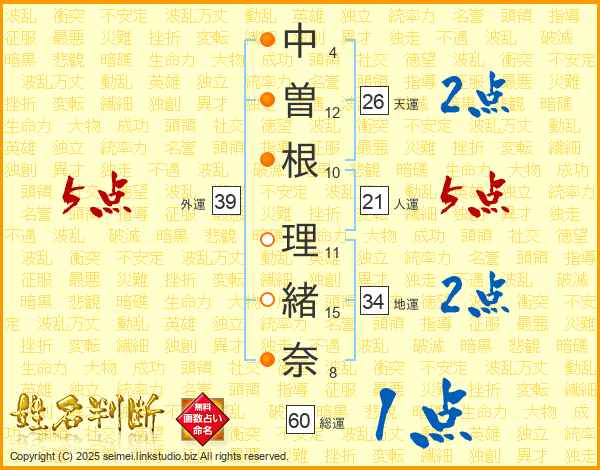 中(4画)曽(12画)根(10画) 理(11画)緒(15画)奈(8画)