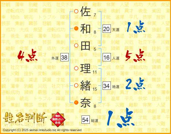 佐(7画)和(8画)田(5画) 理(11画)緒(15画)奈(8画)